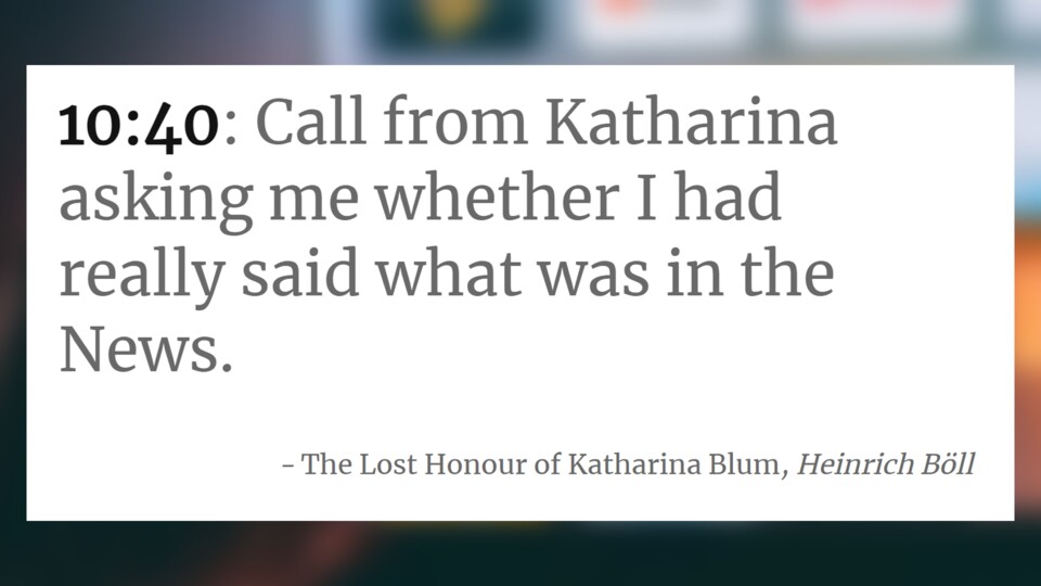 Als Nächstes polterte uns übrigens ein Zitat aus Julia Quinns »Romancing Mr. Bridgerton« entgegen und danach eines aus »Die verlorene Ehre der Katharina Blum« von Heinrich Böll. Ihr seht also, die literarischen Bezüge sind vielfältig.