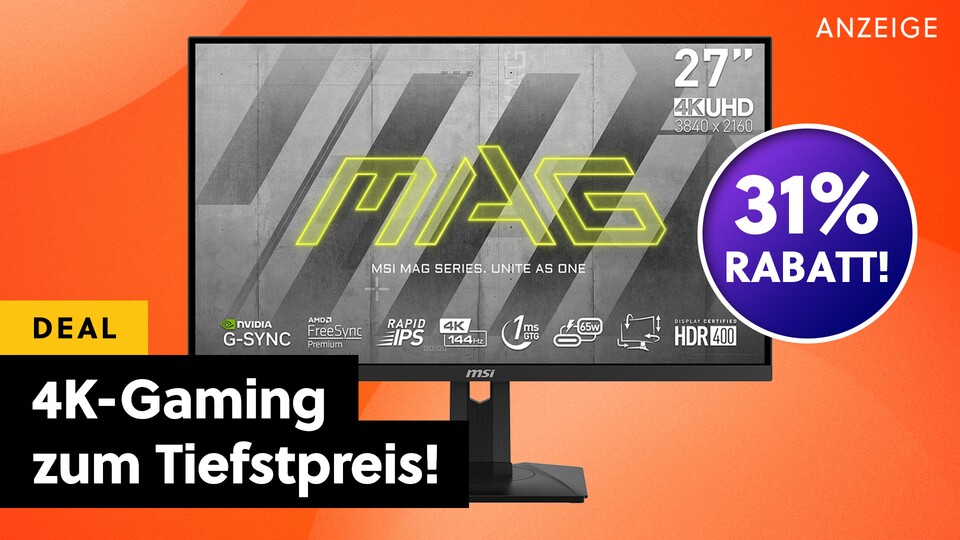 Bei Amazon könnt ihr jetzt ein richtiges Ausnahme-Schnäppchen abgreifen, mit dem ihr euer Gaming-Rig auf die nächste Stufe befördert. Der 27 Zoll große MSI MAG Gaming-Monitor liefert euch hochauflösendes 4K mit superflüssiger 144Hz-Bildwiederholrate und einer blitzschnellen Reaktionszeit von nur einer Millisekunde. Aktuell könnt ihr euch das bildgewaltige 4K-Display zum neuen Tiefstpreis sichern!