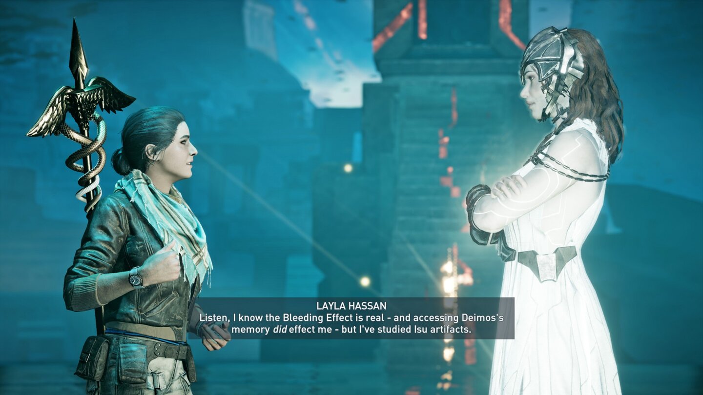 - Layla verbindet sich mit der Maschine, die das Magnetfeld erzeugt und landet in der Simulation von Eivors Valhalla. Dabei lässt sie den Stab fallen, was später noch wichtig wird. Am simulierten Ort trifft sie auf Basim, den Eivor in der Vergangenheit nach seinem Verrat dort einsperrte. Er ist auch der Absender der mysteriösen Nachricht, die Layla zum Grab und damit auch zur Maschine führte.