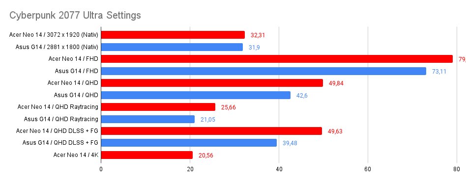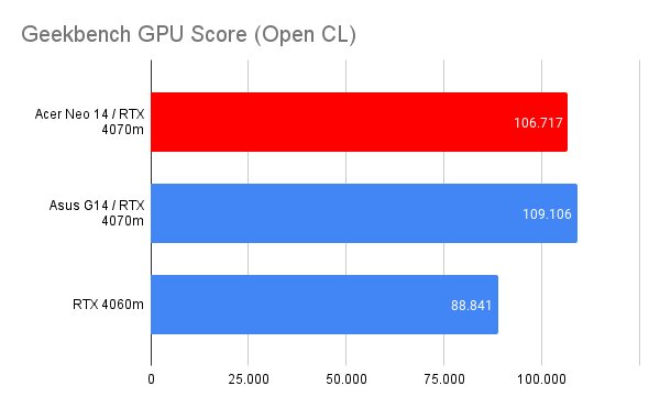 Spannend wird der Vergleich der Grafikkarten, obwohl beide Notebooks den gleichen Grafikchip verwenden, darf sich der Pixelbeschleuniger im Neo 14 125 Watt genehmigen, während es im Asus nur 90 Watt sind.