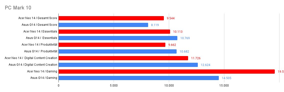 Ein interessantes Bild zeigt sich beim PC Mark 10. Alle CPU lastigen Teile gewinnt das Asus Notebook mit AMD CPU mehr oder weniger knapp. Den grafiklastigen Gaming-Test dominiert dagegen das Neo 14 deutlich.