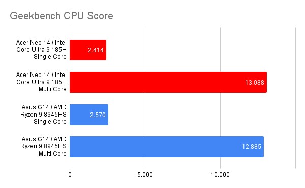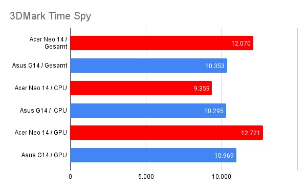 Beim 3DMark Time Spy kann das Acer Neo 14 dann erstmals die Muskeln spielen lassen. Die höhere TGP schlägt sich in einem besseren Ergebnis beim GPU-Teil des Benchmarks nieder. Den höheren Gesamtscore fährt das Acer Notebook am Ende, ebenfalls aufgrund der besseren GPU-Leistung, ein. Im CPU-Benchmark gewinnt dagegen das Modell von Asus mit AMD-CPU.
