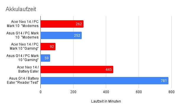 Bei der Akkulaufzeit zeigt sich im Vergleich mit dem Asus G14 ein gemischtes Bild. In den PC Mark 10 Tests liegt das Neo vorne und hält beim Gaming-Benchmark gute 30 Minuten länger durch als sein Konkurrent. Das Blatt dreht sich dann recht deutlich beim Battery Eater Test. Hier Läuft das Asus Notebook trotz kleinerem Akku fast 5 Stunden länger.