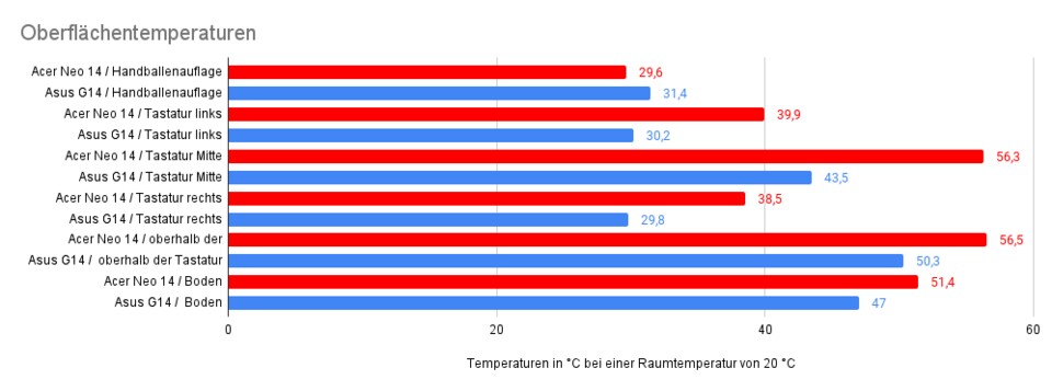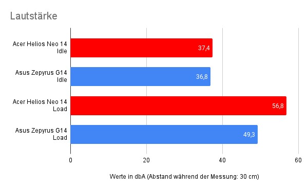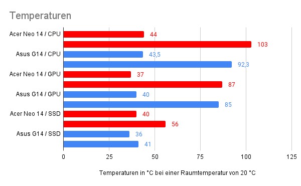 Bei der Leistung kann das Acer Helios Neo 14 überzeugen, doch wie sieht es mit den Temperaturen und der Lautstärke aus? Um es kurz zu sagen, das Neo 14 wird zum Teil ziemlich warm. Im Idle gibt es erwartungsgemäß wenig Unterschiede. Lediglich die SSD wird im Acer Notebook bereits ohne Last 4°C wärmer als beim Asus G14.