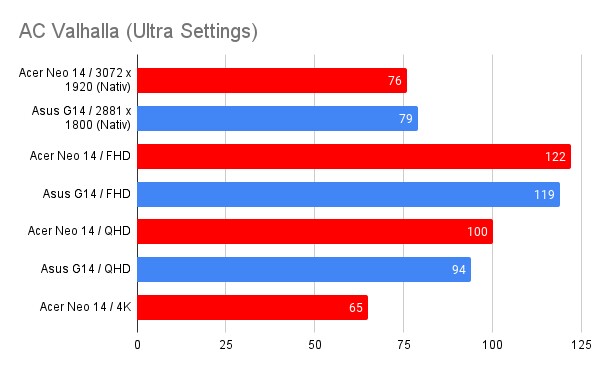 Bei AC Valhalla sind die Abstände deutlich geringer, trotzdem liegt das Acer Notebook fast durch die Bank minimal vorne. Die RTX 4070m mit 125-Watt-TGP bietet euch genug Leistung um das Spiel ohne Abstriche in 4K genießen zu können.