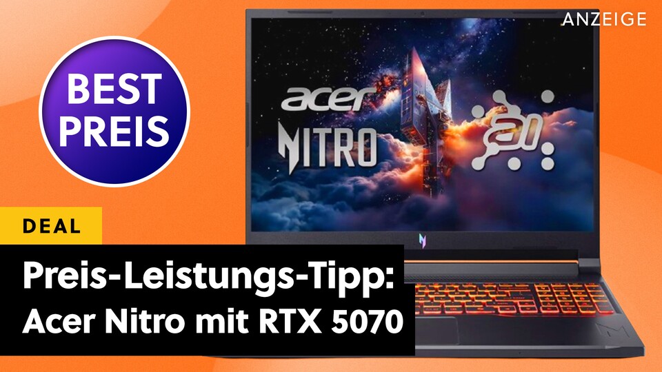 Das Acer Nitro V 16 AI aus dem Amazon-Angebot bietet für das Geld eine Leistungsklasse mehr: Verbaut ist eine RTX 5070, mit der es sich etwas entspannter zocken lässt.