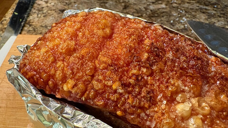 Am nächsten Tag nehmt ihr den Bauch aus dem Kühlschrank und pikst die Haut so oft ihr könnt mit einem spitzen Messer oder Nadel ein – sie sollte über Nacht schon härter und trockener sein. Nehmt euch jetzt ein Stück Alufolie und bastelt eurem Schweinefleisch ein kleines Schiffchen (siehe Bild oben). Nur die Haut sollte offen und das Fleisch ringsherum geschützt sein.