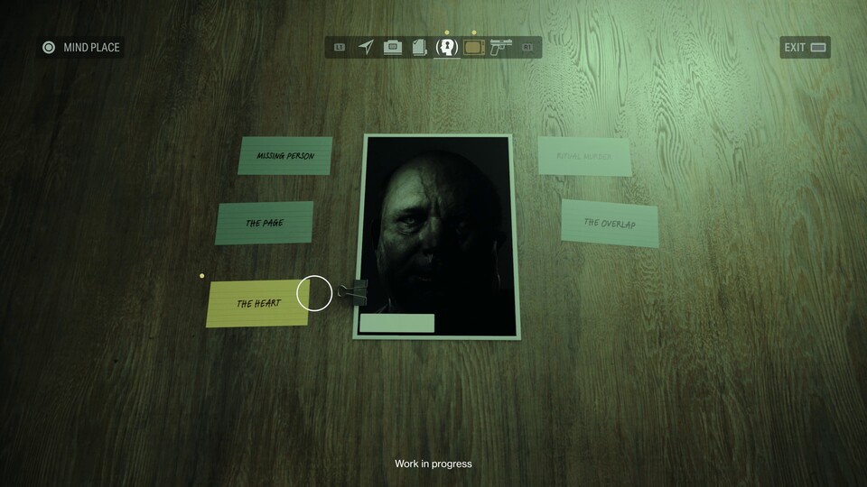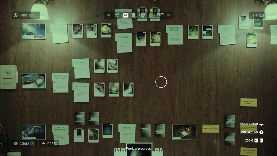 Hier könnt ihr nicht nur eine Karte des aktuellen Levels aufrufen (drei davon große Hub-Areale mit alternativen Pfaden), sondern auch an einer Wand die gesammelten Hinweise, Fotos und Manuskript-Seiten aufhängen. Dabei entstehen automatisch Verbindungen und Schlussfolgerungen, welche die Handlung vorantreiben sowie neue Ziele im Spiel freischalten.