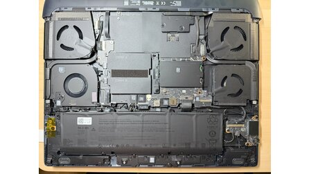 Nach dem Lösen einiger Schrauben gelangt man relativ unkompliziert an die installierte Hardware. Auffällig ist, dass man vom eigentlichen Kühlsystem, abgesehen von den vier Lüftern, wenig sieht. Die Vapor-Chamber befindet sich auf der Oberseite der Hauptplatine. Man kann einige Heatpipes erkennen, die von der Rückseite des Mainboards zu den einzelnen Lüftern führen. Insgesamt stehen drei M.2-Steckplätze zur Verfügung.