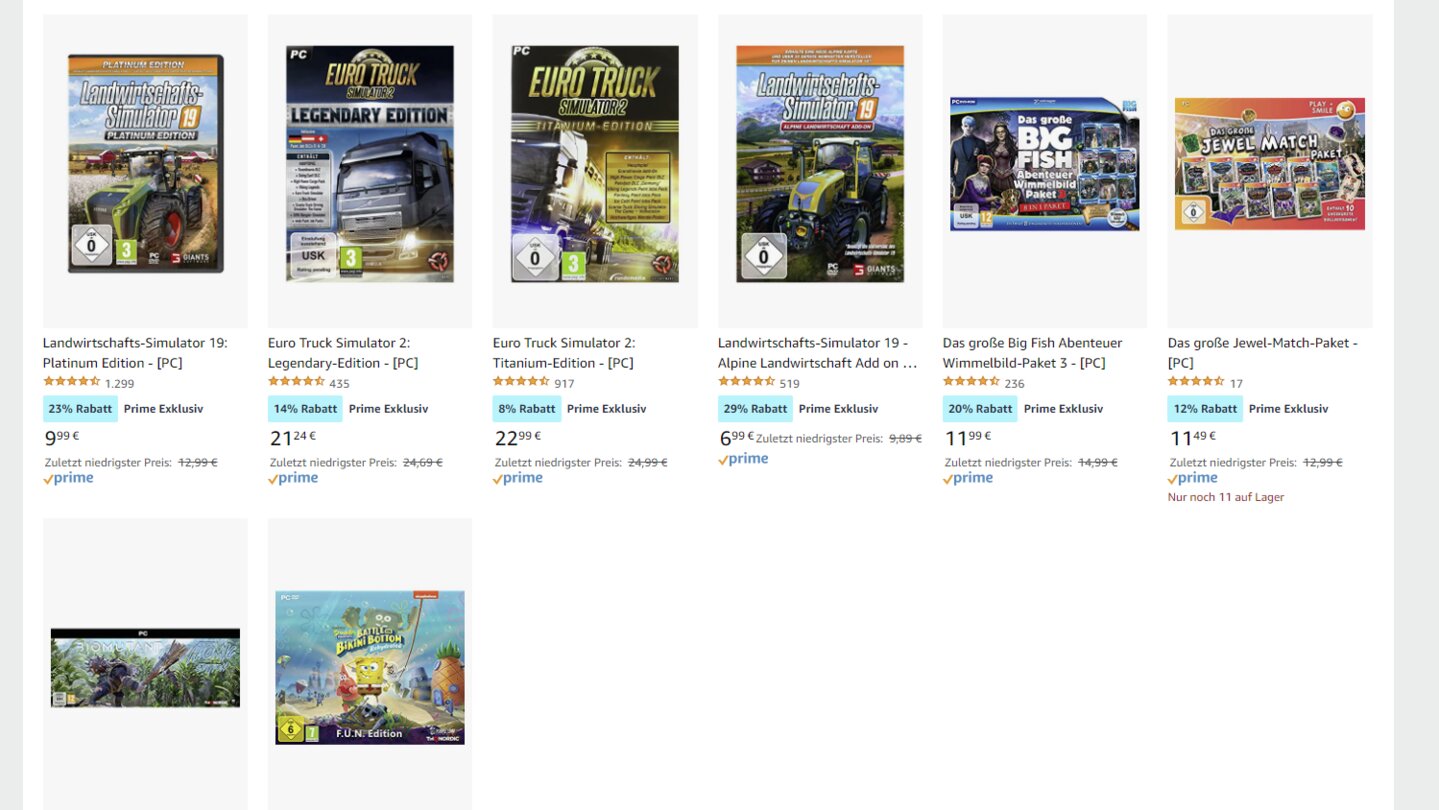 Als PC-Spieler bin ich beim Amazon Prime Day sowieso ziemlich arm dran. Wofür soll ich hier denn bitte mein Geld ausgeben? Für Das große Big Fish Abenteuer? Für Das große Jewel-Match-Paket? Oder doch lieber für den Landwirtschaft Simulator … 19? Ach ne, ich habs! Ich kauf mir den Euro Truck Simulator 2 von 2012. Oder doch lieber Spongebob SquarePants: Battle for Bikini Bottom Rehydrated – in der F.U.N-Edition! Das kam immerhin 2020 raus und kostet gerade nur … ah, 184 Euro.