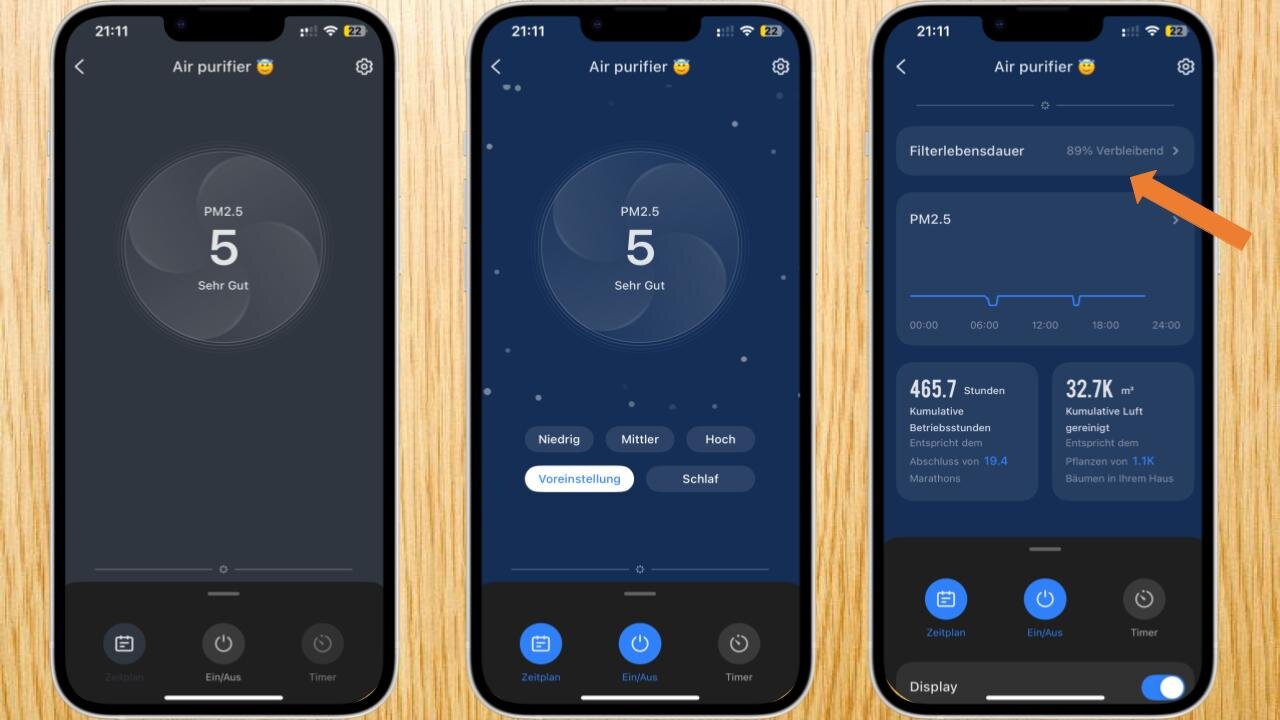 Die App zeigt in Echtzeit die aktuelle Luftqualität an und gibt Feedback, wenn die sich verschlechtert. Besonders praktisch: Man kann Zeitpläne erstellen, etwa um den Reiniger automatisch nachts in den Schlafmodus zu versetzen oder morgens langsam hochzufahren.