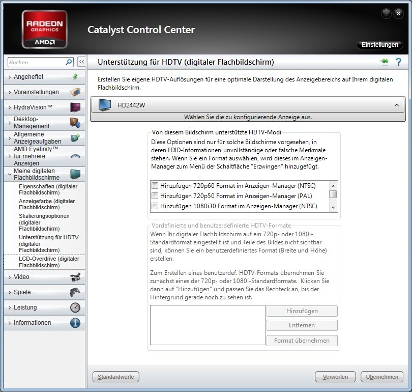 Abhängig von den angeschlossenen Bildschirmen zeigt das Control Center entweder »Eigenschaften« für Röhrenmonitore oder für TFTs an. Bei Röhrenmonitoren kann hier die Bildlage und Größe sowie die Synchronisation verändert werden. Üblicherweise sollten man solche Einstellungen jedoch lieber am Monitor selbst vornehmen.