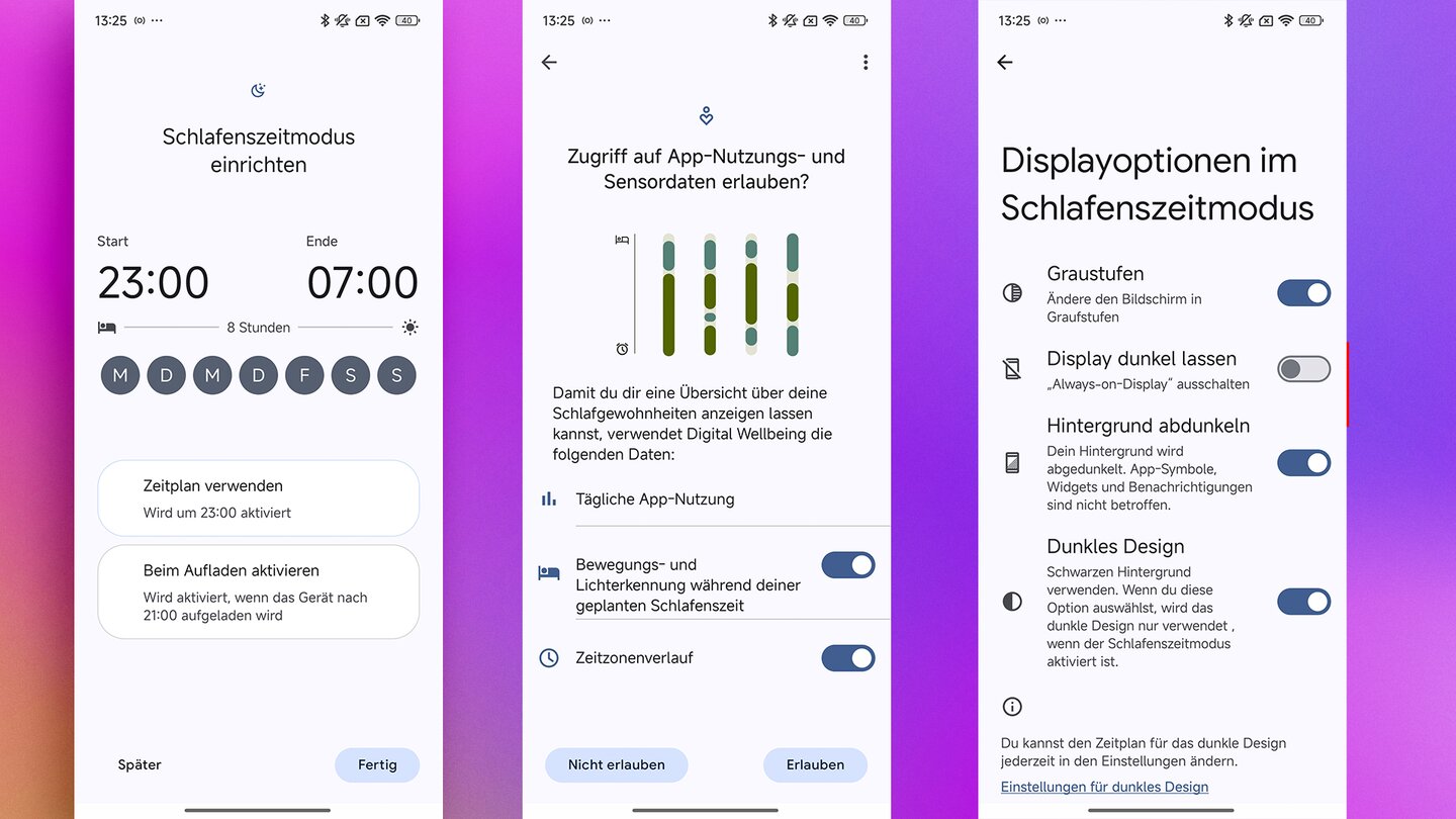 Der Schlafenszeitmodus bietet verschiedene Optionen für die Nachtruhe und die Zeit davor. Unter anderem kann das Display zu Graustufen wechseln – das soll dazu führen, dass das Gehirn weniger Signale erhält und man nicht so an den Bildschirm gefesselt ist.