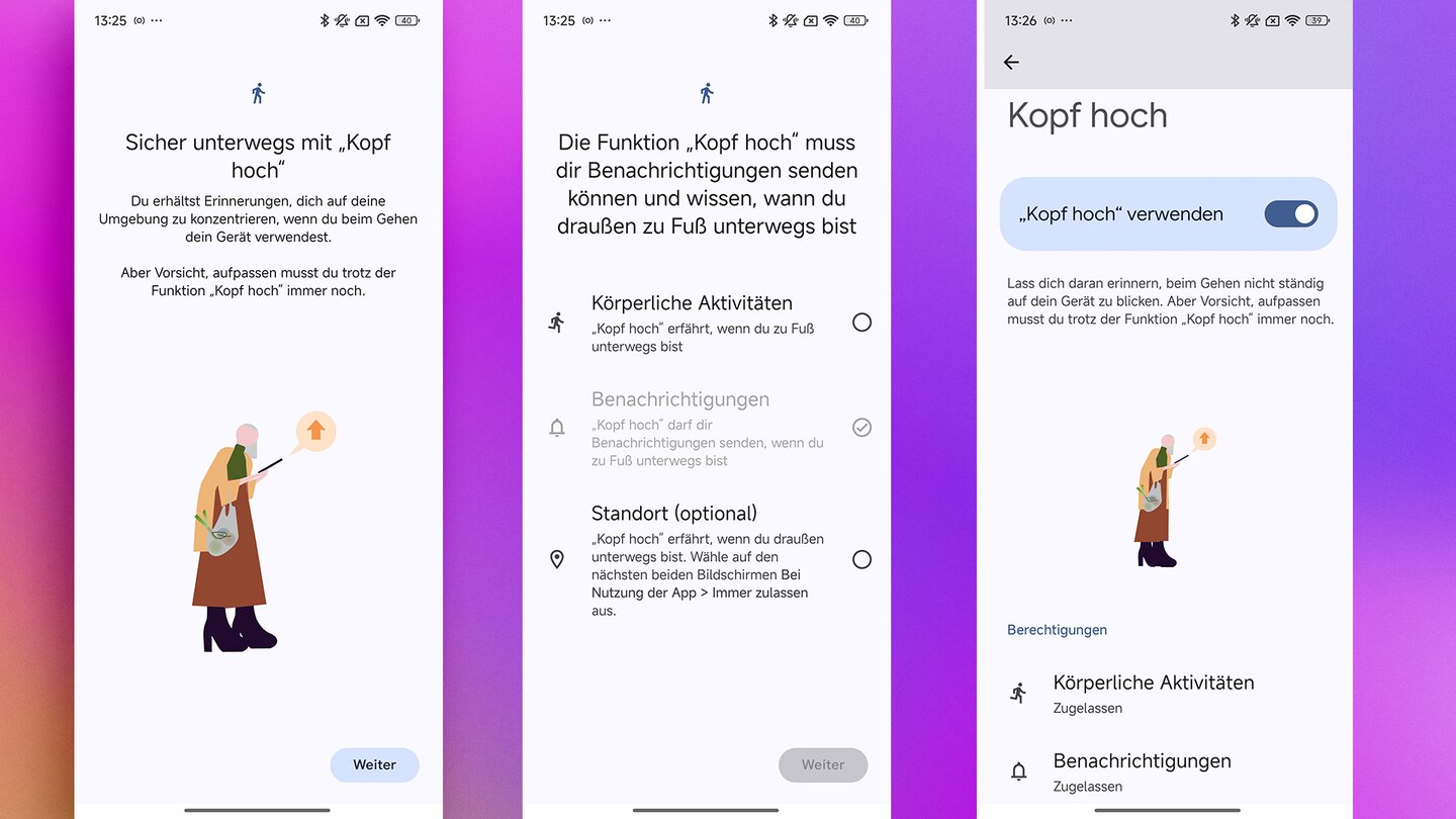 Der Kopf-hoch-Modus erinnert euch daran, aufzublicken, wenn ihr längere Zeit auf das Display schaut – besonders nützlich beim Gehen. Ihr findet ihn in den Einstellungen von Digital Wellbeing unter »Unterbrechungen verringern«.