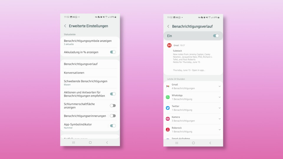 Ist der einmal aktiviert, findet ihr dort alle erhaltenen Push-Benachrichtigungen der jüngeren Vergangenheit. Das ist vor allem dann hilfreich, wenn ihr eine solche versehentlich zur Seite gewischt und damit aus der Mitteilungsübersicht entfernt habt.