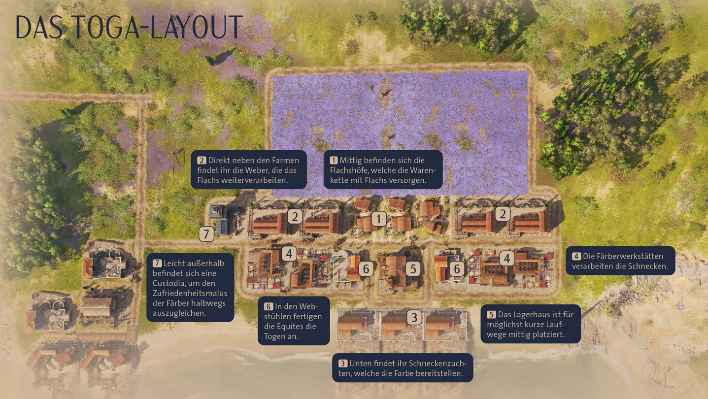 Für das Toga-Layout benötigt ihr 30 Liberti-Arbeitskräfte und 102 Equites-Arbeitskräfte. Fruchtbarkeiten Da sowohl Flachs als auch die Schnecken eigene Fruchtbarkeiten voraussetzen, müsst ihr vielleicht eineProduktion auf eine andere Insel auslagern. Hier bietet es sich an, Flachshöfe oder Zuchten auszulagern, da ihr so nur Liberti als Arbeitskräfte auf der jeweiligen Insel benötigt.