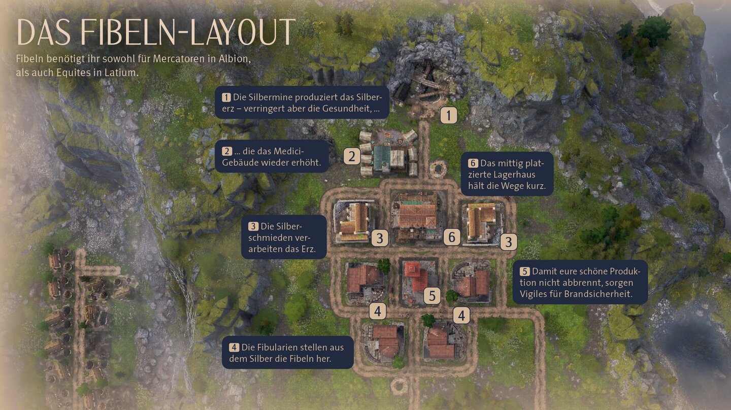 Die Fibeln-Warenkette ist im Verhältnis 1:2:4 + 2 Köhler aufgebaut. Als Grundlage benötigt ihr eine Silbermine, sie produziert in 30 Sekunden eine Tonne Silber. Eine Silberschmiede benötigt eine Minute, um eine Tonne Silber zu verarbeiten, ihr benötigt also zwei Silberschmiede. Das Fibularium setzt dem Ganzen die silberne Krone auf: Es benötigt zwei Minuten, um eine Fibel herzustellen. Das heißt, ihr benötigt ganze vier Fibularien, um die Warenkette optimal abzuschließen. Zusätzlich wollen Silberschmiede und Fibularien mit Kohle versorgt werden – ihr braucht für die Warenkette also noch zwei Köhler.