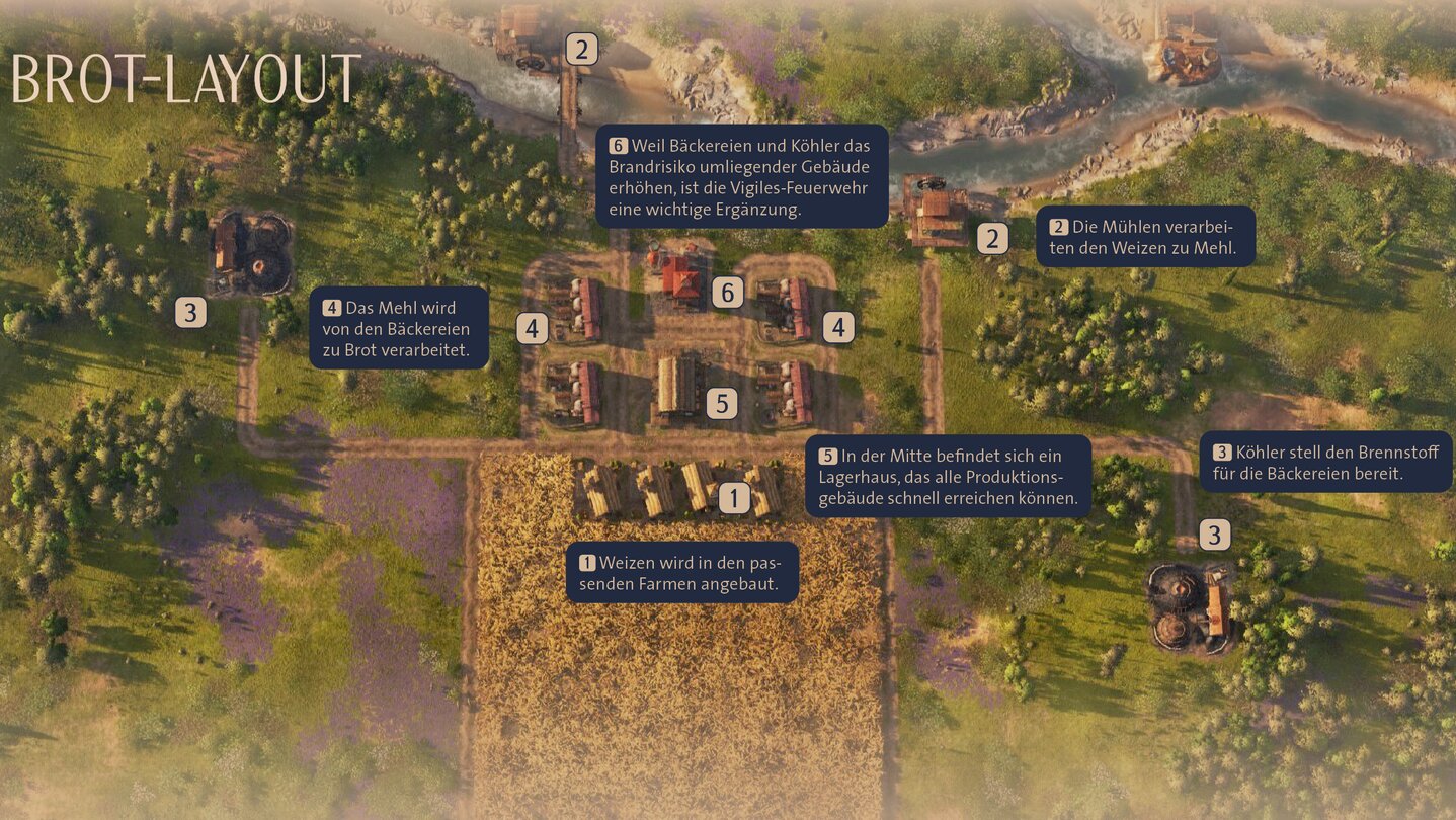 Für die Brotproduktion gilt ein Layout von 2:1:2 (+ Köhler). Ihr braucht also zwei Farmen, eine Mühle, zwei Bäckereien. Warum? Weizenfarmen produzieren in einer Minute eine Tonne Weizen, eine Mühle braucht aber nur 30 Sekunden zum Mahlen einer Tonne Mehl – erst zwei Weizenfarmen decken also den Bedarf einer Mühle.