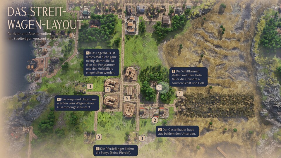 Beginnen wir mit dem Unterbau der Streitwägen – dafür benötigt ihr Schilf und Holz. Ein Schilfsammler produziert in einer Minute eine Tonne Schilf, ein Holzfäller in 30 Sekunden eine Tonne Holz. Ihr benötigt also zwei Schilfsammler und einen Holzfäller. Ponys werden von den Pferdefängern in 1:30 Minuten produziert, ein Unterbau wird von den Gestellbauern ebenfalls in 1:30 hergestellt. Der Wagenbauer dengelt einen Streitwagen in zwei Minuten zusammen, ihr benötigt also jeweils drei Pferdefänger, drei Gestellbauer und vier Wagenbauer. Das Layout ist deshalb 1:2:3:3:4