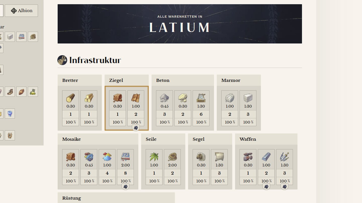 Alternativ könnt ihr über den Rechner für Infrastruktur auch die Warenketten für Baumaterial wie Holz, Marmor oder Mosaike durchplanen und habt die ganze Übersicht, wie viel ihr von jeder Produktionsstätte braucht.