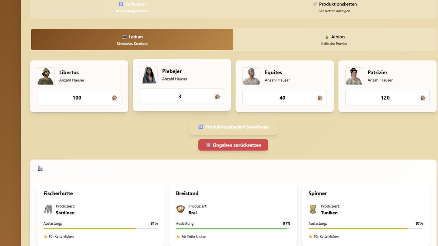 Ebenfalls simpel und leicht zu bedienen ist der Warenrechner von Annoland. Hier findet ihr sämtliche Warenketten, die in Latium und Albion auf euch warten, und bekommt auch direkt angezeigt, wie viele Gebäude im besten Fall auf der Insel stehen sollten, um eine effiziente Produktion zu gewährleisten.