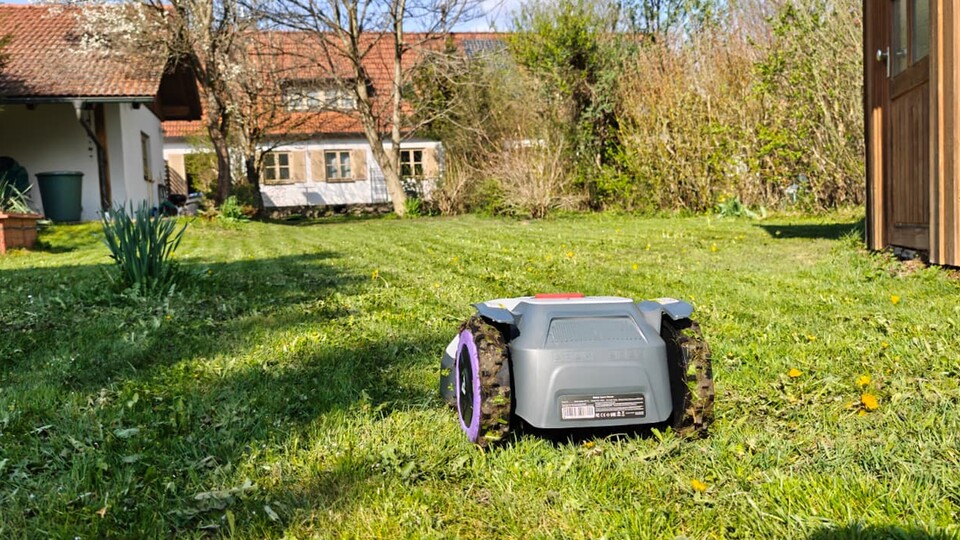 Der Mäher kommt problemlos durch Durchgänge ab etwa 70 cm Breite und erreicht dadurch Stellen, bei denen manch anderes Modell die Reißleine zieht. Gerade in jahrelang gewachsenen Gärten mit Beeten, Wegen oder Gartenmöbeln ist das ein echter Vorteil. Wenn er mit seiner Arbeit fertig ist, parkt er so dezent in seiner Station, dass er fast schon unsichtbar wird. Für alle von euch, die keinen riesigen Fuhrpark im Garten stehen haben wollen, ist das ein großer Pluspunkt.