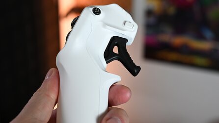 Die Steuerung funktioniert überraschend intuitiv, das Laserpointer-Prinzip scheint dafür die goldrichtige Wahl zu sein. Ich ziele einfach dorthin, wo die Drohne hinfliegen soll, und reguliere die Geschwindigkeit mit dem schwarzen Hebel. Das erweist sich als absurd clever und überraschend natürlich.