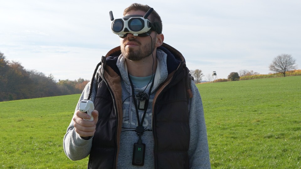 Unabhängig von der Sicht löst das Bild in der Brille mit 2K bei 30 FPS auf. Das klingt nach wenig, und ein Rauschen durch die Videoübertragung von der Drohne zur Brille ist definitiv zu sehen. Es reicht jedoch aus und tut dem Flugspaß wenig Abbruch.