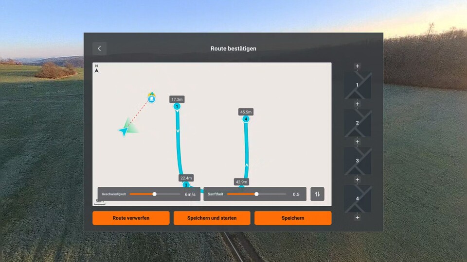 Im Menü gibt es außerdem die Option, eine eigene Flugroute zu erstellen. Dazu setzt ihr per Fernbedienung Marker in die Landschaft, die die Drohne anschließend automatisch abfliegt.