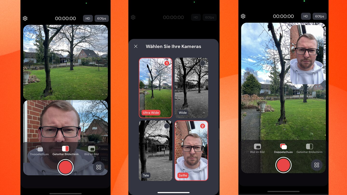 Neben der Auswahl der Kameralinse könnt ihr auswählen, wie euer Multi-Cam-Video aussehen soll. Daneben lässt sich auch die Auflösung und Bildrate einstellen.