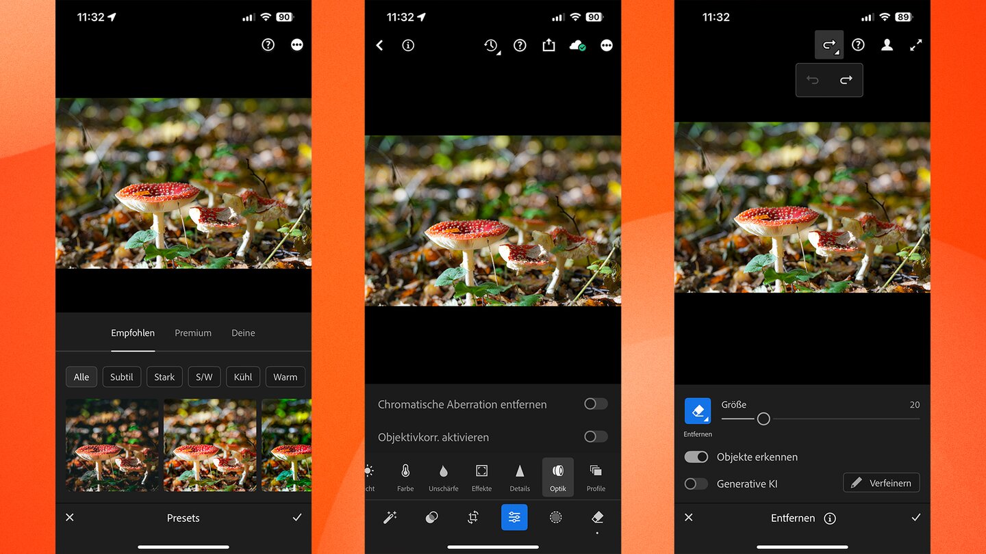 Daneben bietet die App auch einen Objektradierer, mit dem ihr störende Objekte aus dem Foto entfernen könnt. Zusätzlich gibt es Funktionen wie Objektivkorrektur, verschiedene Farbprofile und mehr.