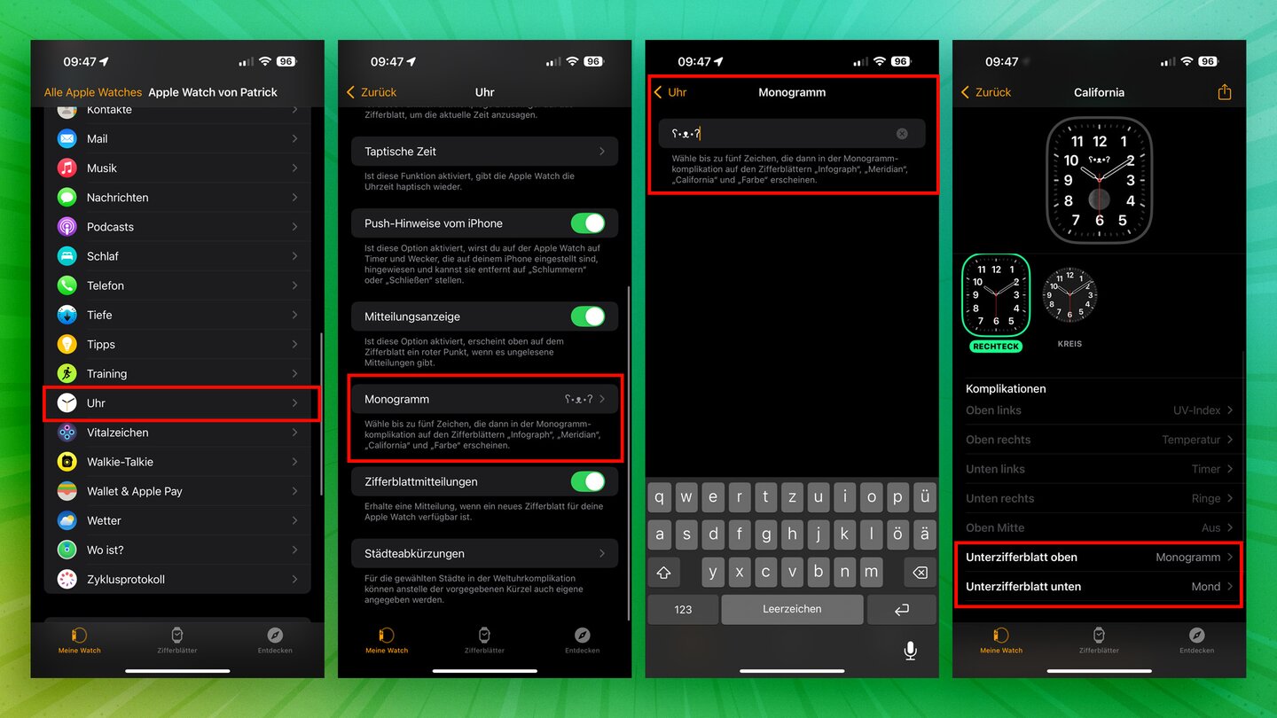 - Scrollt runter zum Punkt »Uhr« und wechselt anschließend zu Monogramm.