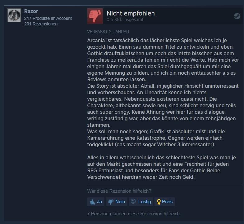 "Arcania ist tatsächlich das [...] Spiel, welches ich je gezockt habe. [...] Da fehlen mir echt die Worte. [...] An Linearität kenne ich nichts vergleichbares. Nebenquests existieren [...] Die Charaktere, altbekannt sowie neu, sind schlicht [...] super [...]. Keine Ahnung wer hier für das Dialog-Writing zuständig war [...]. Was soll man noch sagen [...]. Grafik ist [...] Witcher 3 [...]. Alles in allem wahrscheinlich das [...] Spiel [...] für jeden RPG-Enthusiasten und besonders für Fans der Gothic-Reihe. [...]"