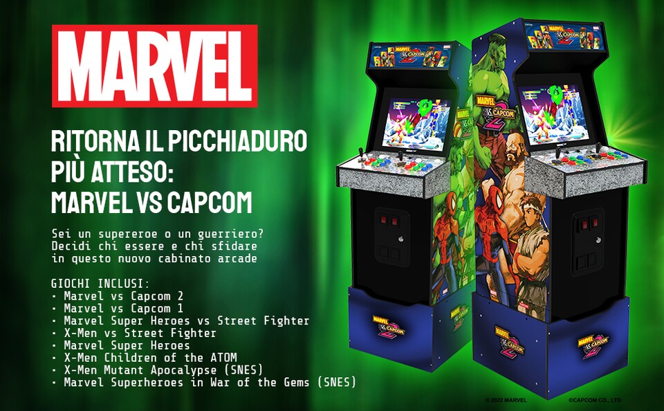 Der 154,2 cm hohe Automat ist nicht nur ein echter Blickfang mit seinem beleuchteten Marquee, sondern bietet vor allem massig Fighting-Action. Als Herzstück dient Marvel vs. Capcom 2, in dem ihr Superhelden wie Wolverine gegen Street Fighter-Ikonen wie Ryu antreten lasst.