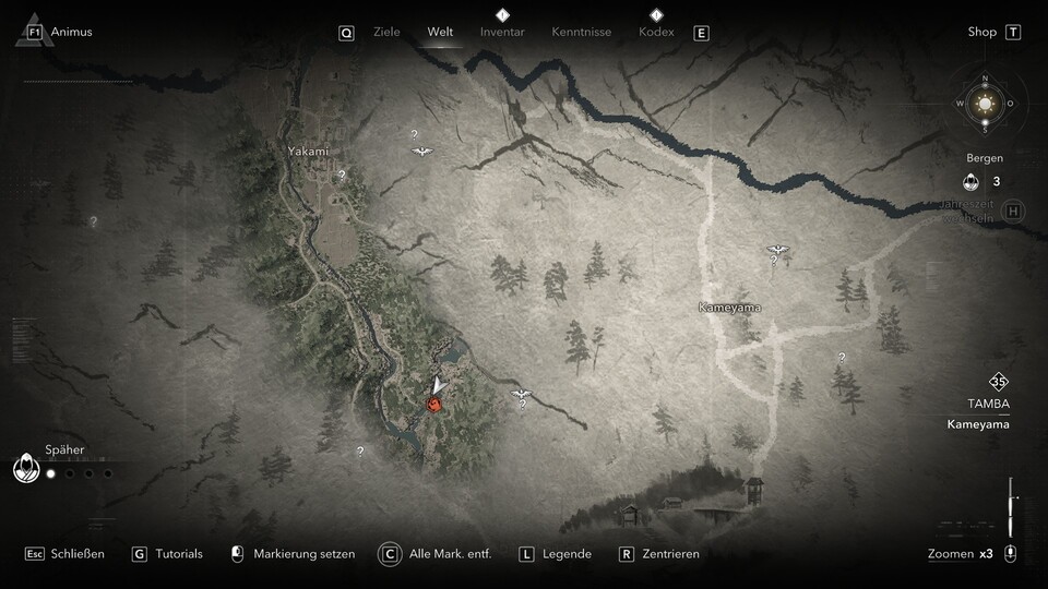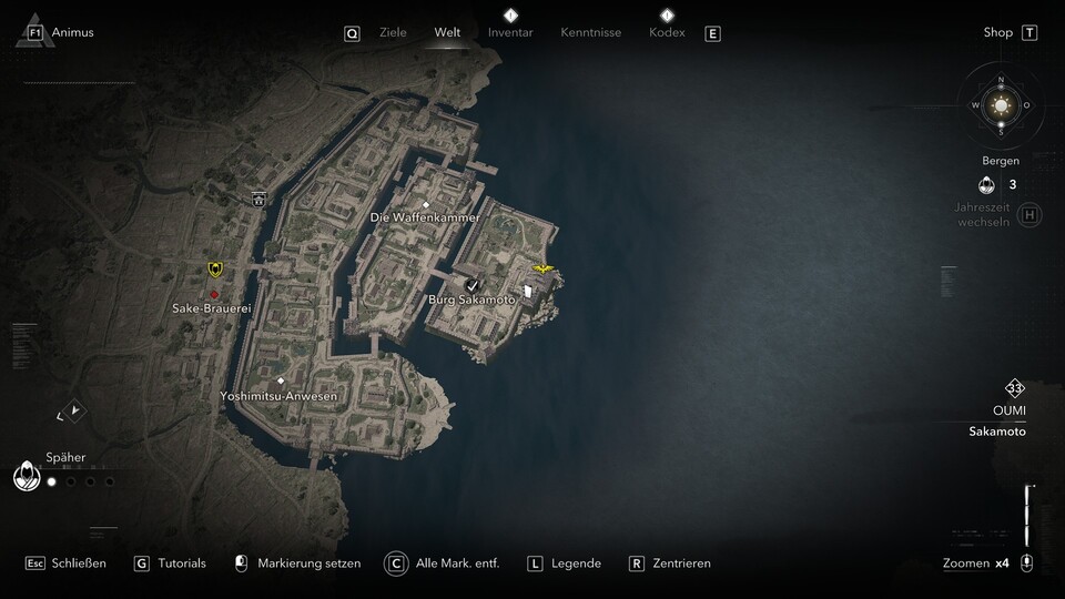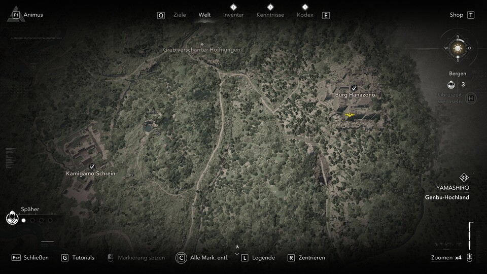 Den passenden Helm des Beschützers findet ihr in der Burg Hanazono in einer legendären Truhe im Hauptturm der Burg. Auch hier müsst ihr zuerst die Samurai-Daisho in der Festung erledigen. Die Burg liegt im Nordosten der Provinz Yamashiro in der Region Genbu Hochland. Im obigen Screenshot seht ihr den genauen Ort.