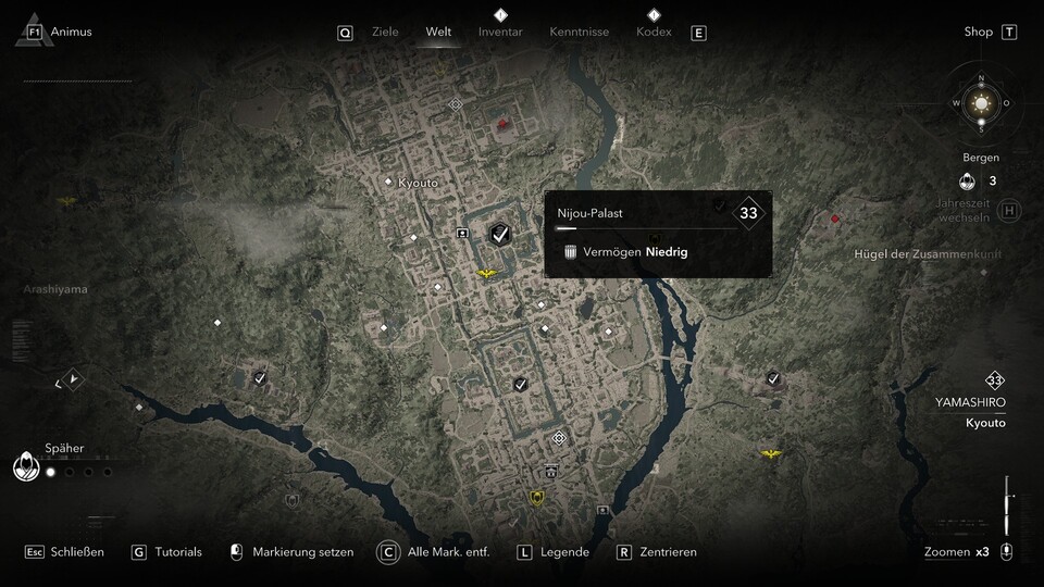 Die Rüstung befindet sich im Nijou-Palast im Zentrum von Kyoto (Gebiet Yamashiro). Habt ihr Yasuke freigeschaltet, kennt ihr die Stadt schon. Der Palast ist wie andere Burgen natürlich Sperrgebiet, wollt ihr euch also nicht mit einer ganzen Garnison anlegen, dann schleicht euch am besten mit Naoe rein.