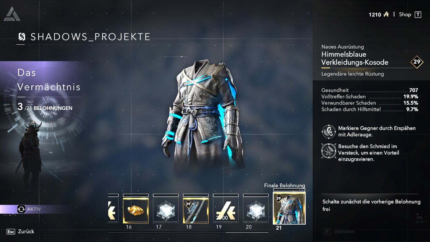 Dafür müsst ihr das Shadows-Projekt »Das Vermächtnis« abschließen. Die Himmelsblaue Verkleidungs-Kosode ist die finale Belohnung des Mini-Battle-Passes.