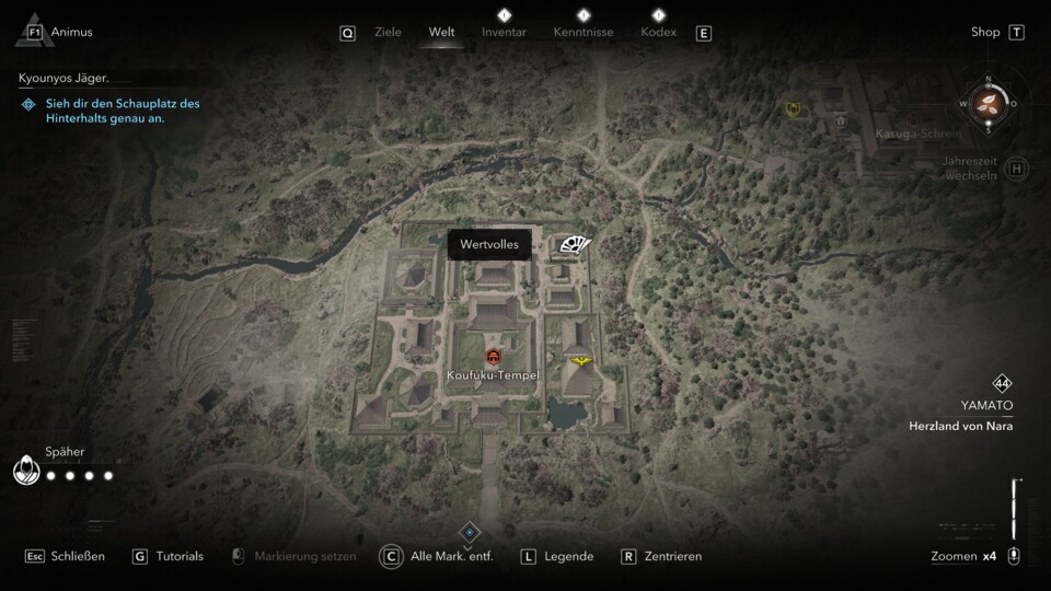 Das Kalligrafieset bekommt ihr im Koufuku-Tempel im Herzland von Nara. Das liegt im nördlichen Teil der Provinz Yamato, südlich des Toudai-Tempels. Im Westen befindet sich Kouriyama und im Osten Uda Matsuyama. Der Schatz selbst ist im nordöstlichsten Gebäude des Tempelkomplexes versteckt, auf der Karte also rechts oben in der Ecke.