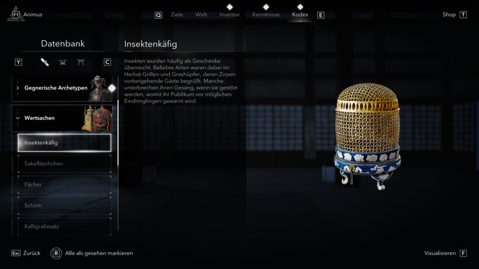 Den Insektenkäfig bekommt ihr in der Burg Katano. Die befindet sich in der Startregion Izumi Settsu, südlich des Flusses der die Provinz in eine nördliche und eine südliche Hälfte teilt. Katano liegt nordöstlich von Osaka und nordwestlich vom Katano-Vorgebirge. Der Schatz ist im Tenshu, also im höchsten Turm, wo sich auch der Aussichtspunkt befindet.