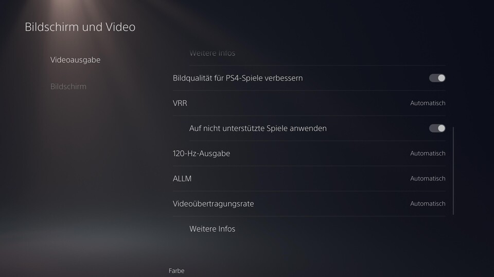 - Stellt sicher, dass ihr auf eurer PS 5 Pro unter Einstellungen / Bildschirm und Video sowohl VRR als auch 120-Hz-Ausgabe auf »automatisch« gestellt habt.