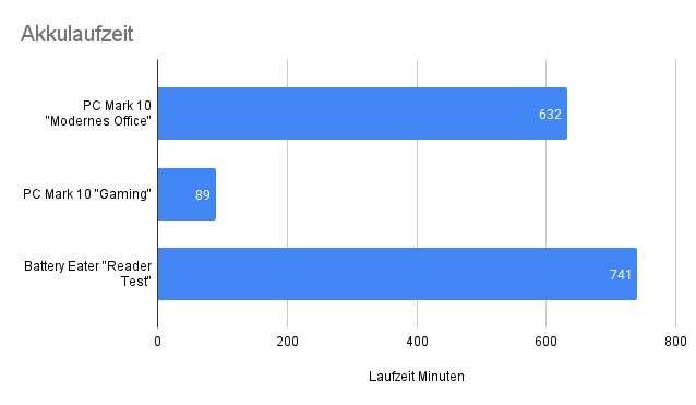Im Gaming-Test hält das Gerät rund 90 Minuten durch, vergleichbare Laptops schaffen auch nur selten längere Laufzeiten.