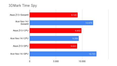 Ein wenig anders sieht es beim 3DMark Time Spy aus. Hier hält die Kombination aus Intel-Prozessor und Nvidia-Grafik in allen Tests die neue AMD CPU meist mit größerem Abstand auf Distanz.