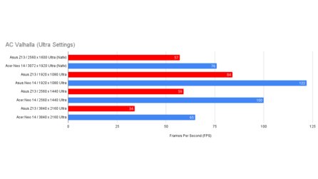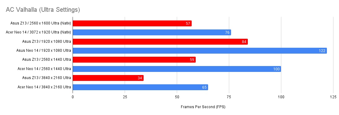 Auch Assassin's Creed Valhalla lässt sich in Ultra Details bis zur 4K-Auflösung flüssig spielen. Dennoch hat man den Eindruck, dass ACV der Radeon 8060S nicht so richtig schmecken will.