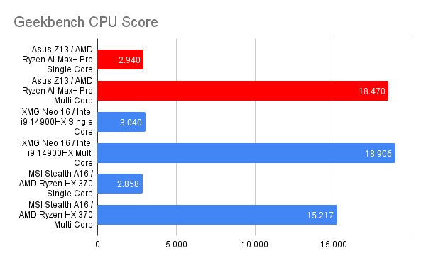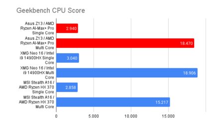 Beim Geekbench CPU-Score bewegt sich der neue Ryzen AI-Max+-Pro trotz 8 Kernen weniger auf Augenhöhe mit Intels 14900H. Der Ryzen HX 370 (12 Kerne) wird sowohl im Single- als auch im Multi-Core klar geschlagen.