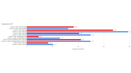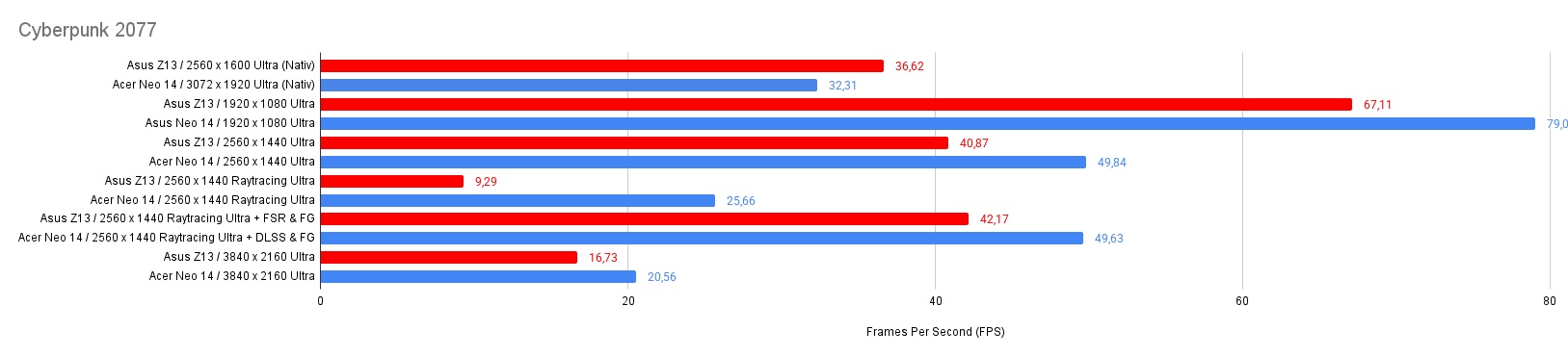 In FHD liegt die Nvidia Karte 45 Prozent in Front, in QHD sind es 69,5 Prozent und in 4K ist die 4070m dann fast doppelt so schnell. Trotzdem gibt es keine andere integrierte Grafik, mit der das Spiel in QHD und in Ultra-Details flüssig gespielt werden kann.