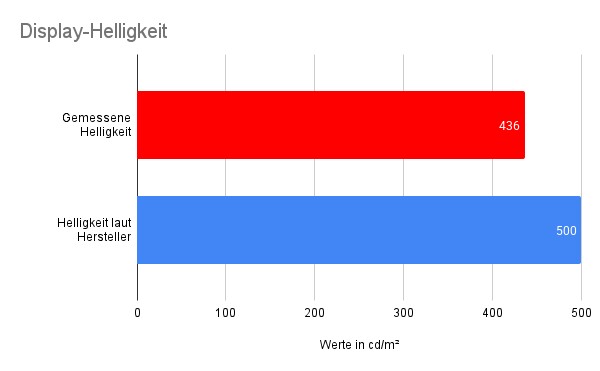 Asus bescheinigt dem Panel einer Dauerhelligkeit von 500 Nits, was 500 cd/m² entspricht. Gemessen habe ich 436 cd/m², das Display bleibt damit also ein Stück dunkler als beworben.