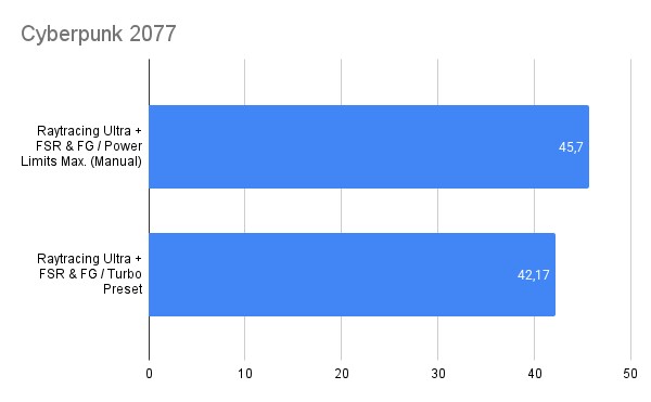 Hier hätte ich dann doch etwas mehr erwartet, auch da Cyberpunk relativ CPU-lastig ist. Durch das Anheben der Power-Limits kann nur eine Mehrleistung von maximal 8,37 Prozent erreicht werden.