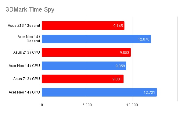 Während der Tests wurde das Z13 mit dem Acer Neo 14 verglichen, dessen RTX 4070m mit einer TGP von 125 Watt arbeitet. Der Prozessor des Asus Z13 genehmigt sich dagegen maximal 72 Watt, und das wohlgemerkt für CPU und Grafik zusammen!