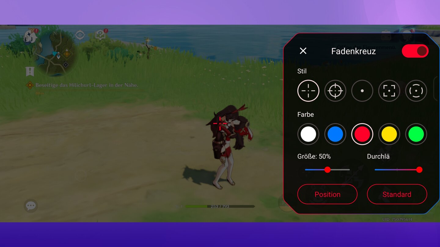 Fadenkreuz: Man kann ein Fadenkreuz in der Mitte eures Bildschirms anzeigen lassen. Dieses lässt sich in Form und Farbe anpassen.
