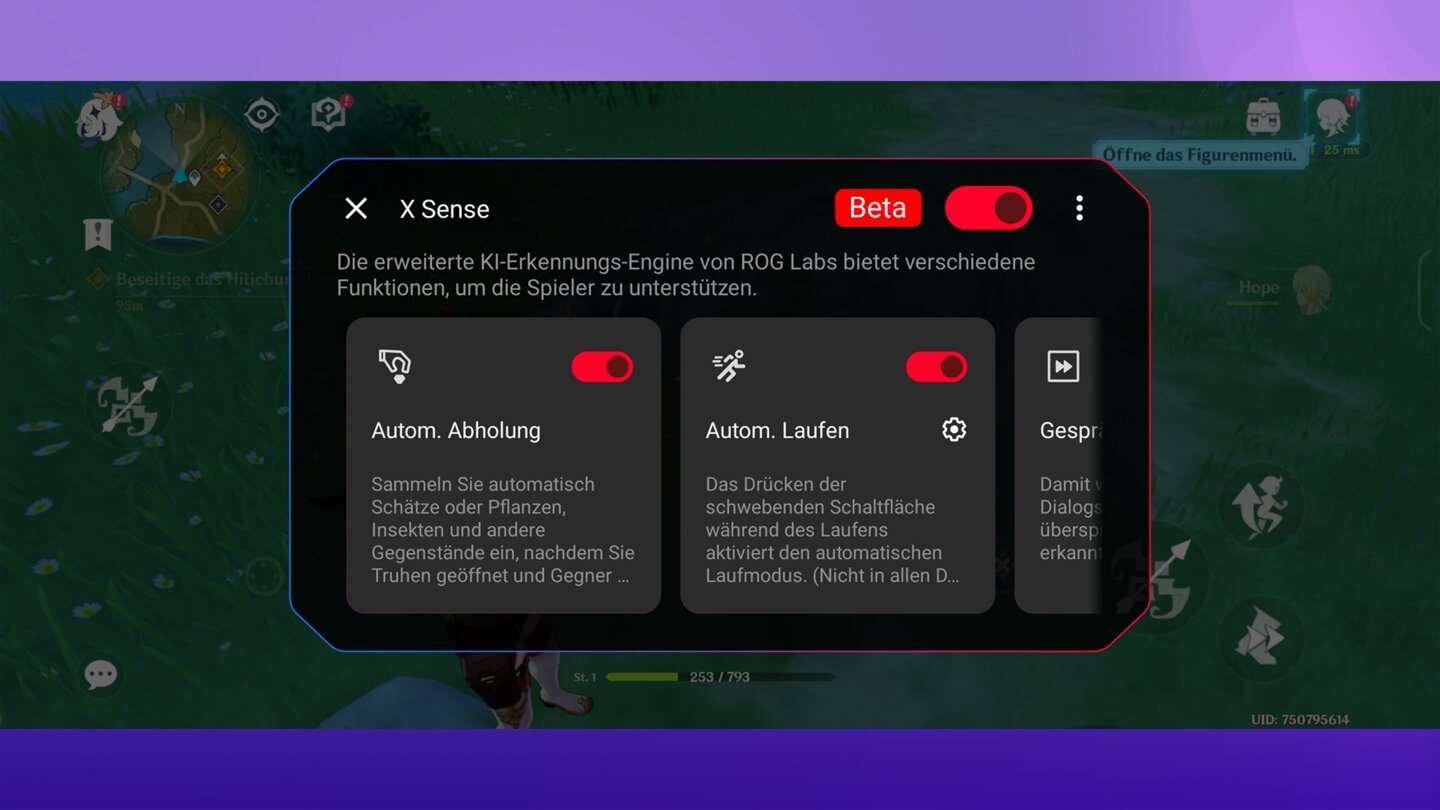 X-Sense: Hierbei handelt es sich um ein KI-Feature, das euch erlaubt, Aktionen in bestimmten Spielen automatisch auszuführen, zum Beispiel automatisches Laufen auf Knopfdruck aktivieren. Ich bin kein Fan davon, Charaktere mit einem virtuellen Touchscreen-Joystick zu steuern und so muss ich nur mit dem rechten Daumen die Blickrichtung ändern.